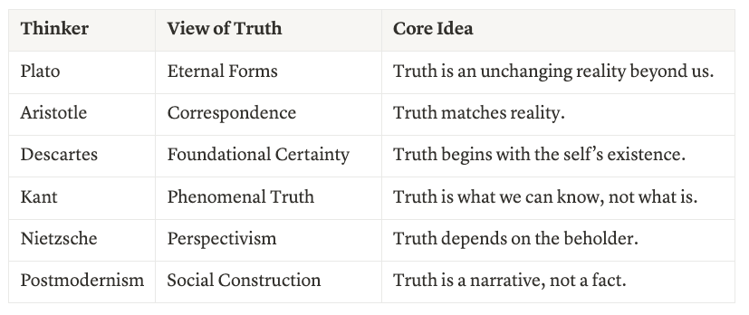 In the 19th century, Friedrich Nietzsche tosses a grenade into the mix. “There are no facts, only interpretations,” he declares. Truth, Nietzsche proposes, is a kaleidoscope of perspectives, shaped by power, will, and individual experience. Postmodernists like Foucault and Derrida pick up this thread, arguing that truth is a social construct, a story woven by cultures and authorities. It is true that cultural views change interpretations such as differences viewed between honor-shame, guilt-innocence, and fear-power, but Nietzsche and postmodernists go beyond this simple cultural dynamic towards an understanding of truth that the Bible and several secular thinkers before them would not support.